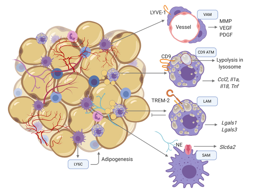 Figure 1. Distinct macrophage populations in obese adipose tissue. Obese fat tissue of mice and humans contain multiple distinct populations of ATMs with unique tissue distributions, transcriptomes, and functions. ATM, adipose tissue macrophage; VAM, vascular associated macrophage; LAM, lipid associated macrophage; SAM, sympathetic associated macrophage.