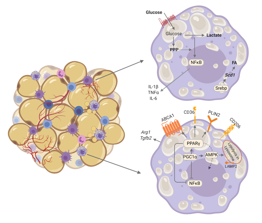 Figure 2. Metabolic pattern of adipose tissue macrophages (ATMs) in obesity. Studies have reported upregulation of glycolysis which is associated with higher expression of inflammatory cytokines in ATMs. In other studies ATMs also have upregulation of lipid metabolism pathways engaged by AMPK, PGC1α, PPARγ and lysosomes. This pattern upregulates genes involved in regulating lipid trafficking such as ABCA1, CD36, PLIN2, CD206, Arg1 and Tgfb2 (associated with pro-resolutive responses), while downregulates inflammatory genes such as IL1b, Tnf and Il6. The distinct findings among studies may be due to collection of different populations of ATMs, or even due to different timing among the studies in ATMs.