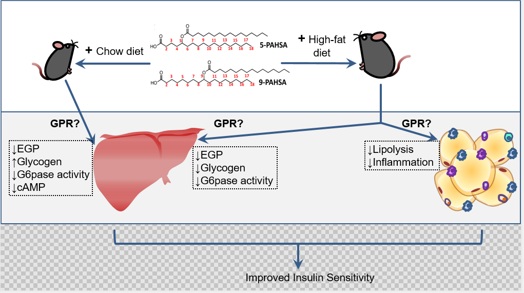 Figure 1. Schematic representation of PAHSAs’ role in liver and adipose tissue. Administration of 5- and 9-PAHSAs results in improved insulin sensitivity due to various metabolic effect on liver and adipose tissue in chow and high-fat diet fed mice. The effects are mediated by G-protein coupled receptors (GPR) that needs to be defined for the organ-specific pathways.