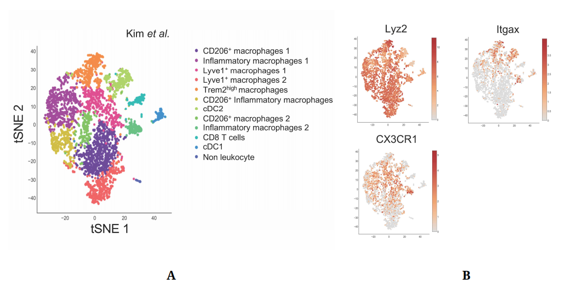 Figure 1. Single-Cell approaches highlight plaque immune cell diversity. (A) Single-Cell RNA-Seq of aortic CD45+ cells from Ldlr−/− mice fed a HFD for 12 weeks. Data from Kim et al. [23] (GSM3215435) were analyzed using the Single-Cell Explorer software. List of markers used: CD206+ Macrophages: Fcgr1, Itgam, Mafb, Mrc1. Inflammatory macrophages: Fcgr1, Itgam, Mafb, NLRP3, IL1b, Nfkbia. Lyve1+ macrophages: Fcgr1, Itgam, Mafb, Lyve1. TREM2high macrophages: Fcgr1, Itgam, Mafb, TREM2, ABCG1, Lpl, Lipa. CD206+ Inflammatory macrophages: Fcgr1, Itgam, Mafb, Mrc1, NLRP3, IL1b (low), Nfkbia, TNF. CD8 T cells: Lck, CD3, CD8. cDC2: Zbtb46, Itgax, Flt3, Itgam (+), Itgae (−). cDC1: Zbtb46, Itgax, Flt3, Itgam (−), Itgae, IRF8. Non leukocyte: Ptprpc (−). (B) Expression pattern of genes used for targeted Cre expression in myeloid cells.