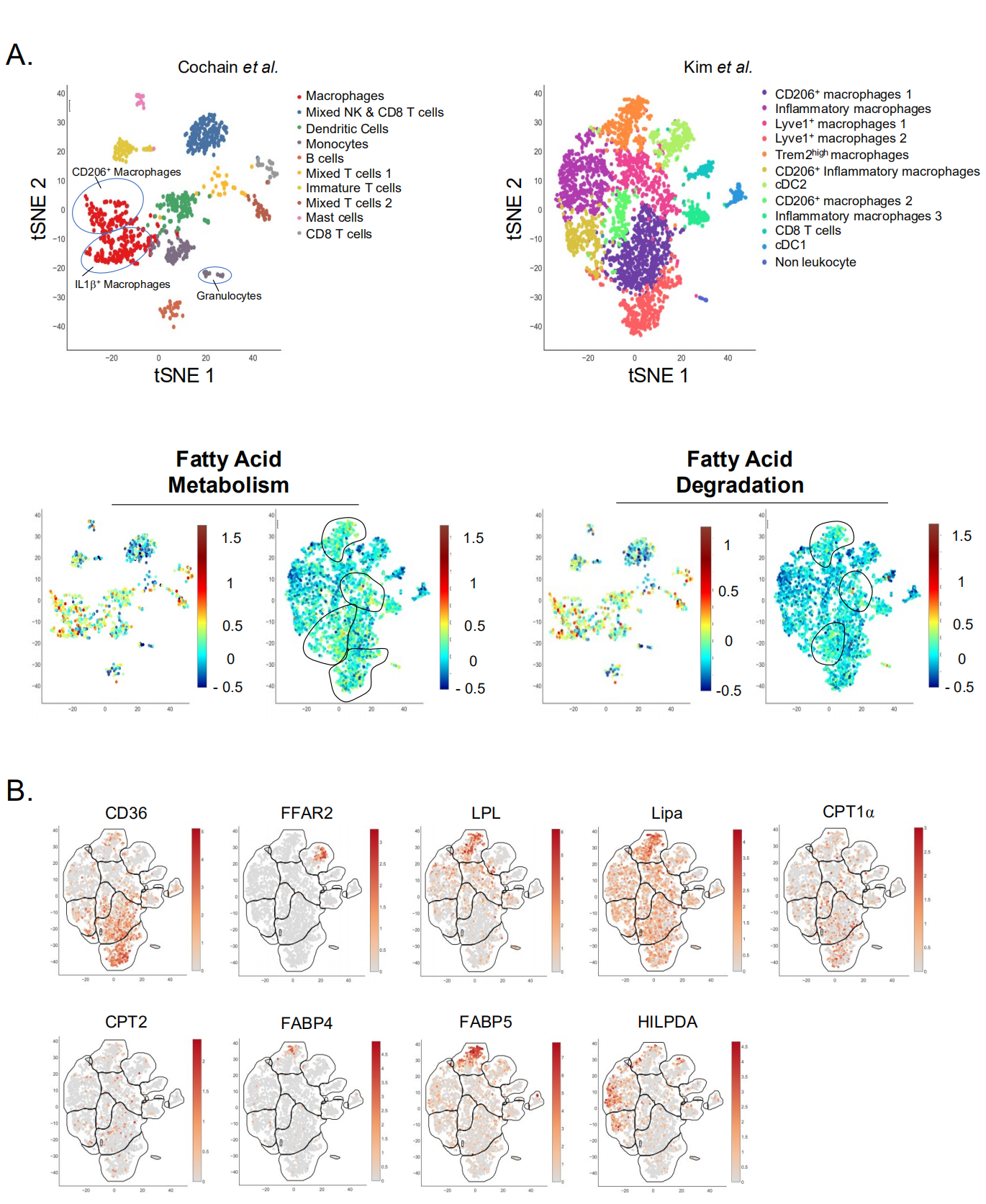 Figure 2. Single-Cell analysis of plaque immune cell lipid metabolism. (A,B) Single-Cell RNA-Seq of aortic CD45+ cells from Ldlr−/− mice fed a HFD for (left) 11 weeks or (right) 12 weeks. Data from (left) Cochain et al. [21] (GSE97310) and (right) Kim et al. [23] (GSM3215435) were analyzed using the Single-Cell Explorer software (Artyomov lab). (A) Leukocyte clusters and corresponding KEGG Metabolic Pathway analysis. Fatty-Acid metabolism: KEGG mmu01212. Fatty-Acid degradation: KEGG mmu00071. List of markers used in Cochain et al. Macrophages (mixed subsets): Itgam, Fcgr1, MerTK. Mixed NK and CD8 T cells: CD3, CD8, Klrb1c, Ncr1, Gzmb. Dendritic Cells (mixed subsets): Itgax, Ciita, Zbtb46. Monocytes: Itgam, Fcgr1, Ly6C, CCR2. B cells: Ciita, CD19, CD79α/β. Mixed T cells: Lck, CD3, CD4, CD8, Rag1. Immature T cells: Lck (−), CD3(+), Rag1 (−), CD4 (−), CD8 (−). Mast cells: Furin, Il1rl1. CD8 T cells: Lck, CD3, CD8. Markers used in Kim et al. are in the legend for Figure 1A. (B) Expression pattern of genes involved in lipid metabolism (Kim et al. [23] (GSM3215435)).