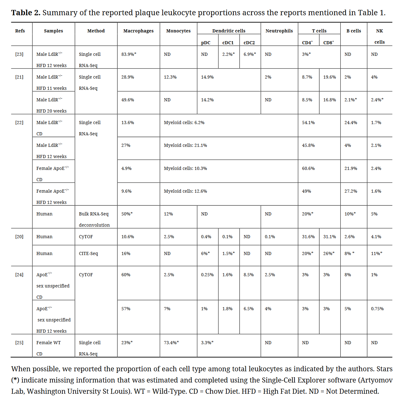 Table 2. Summary of the reported plaque leukocyte proportions across the reports mentioned in Table 1.
