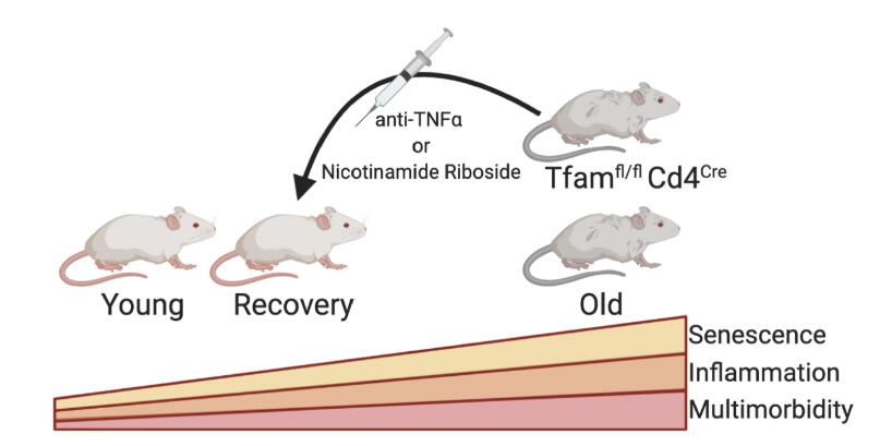 The authors validated that this multimorbidity phenotype was due to a mitochondrial defect specifically in T cells by creating a T cell-specific Tfam deficient mouse model, Tfamfl/flLckCre. These animals also showed a prematurely aged phenotype by elevated expression of the senescence-associated markers p21 and p53. Incubation of hepatocytes or pre-adipocytes with serum from Tfamfl/flCd4Cre animals or with TNFα also increased p21 expression, supporting the idea that inflammation induces senescence and premature ageing. They also gave Tfamfl/flCd4Cre animals nicotinamide riboside (NR), the NAD+ precursor that declines with age and is a metabolic cofactor with a critical role in mitochondrial function. The use of NR was found to be protective against premature senescence and most but not all features of multimorbidity (Figure 1).