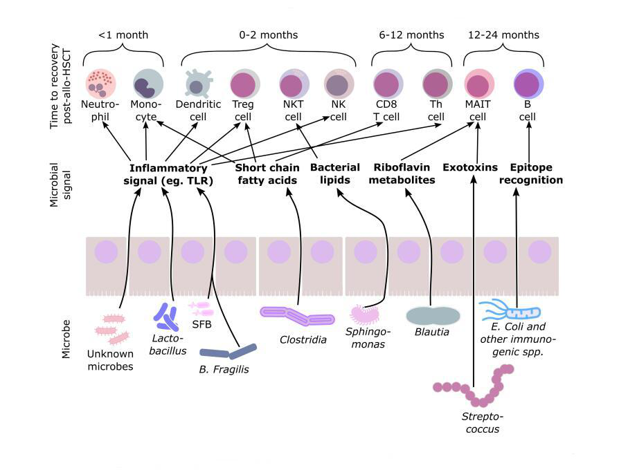 Figure 1. Time to recovery of immune cell subsets following allogeneic hematopoietic stem cell transplantation (allo-HSCT) and representative associations between components of the gut microbiome and selected immune subsets in normal development. Abbreviations: NK, natural killer; Th, T helper cells; Treg, Regulatory T cell; MAIT, mucosal-associated invariant T cell; SFB, segmented filamentous bacteria. References as per Table 2.