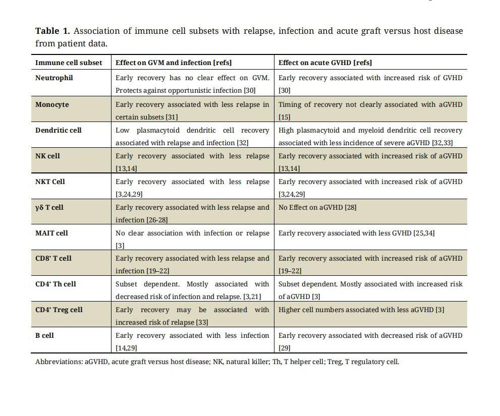 Table 1. Association of immune cell subsets with relapse, infection and acute graft versus host disease from patient data.