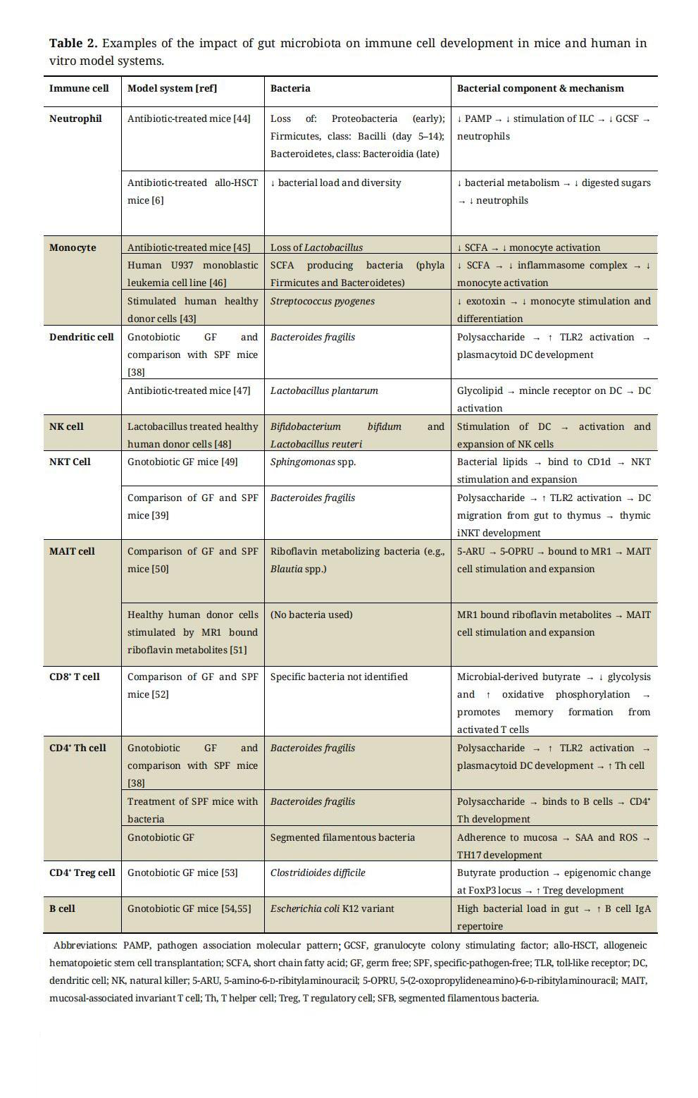 Table 2. Examples of the impact of gut microbiota on immune cell development in mice and human in vitro model systems.