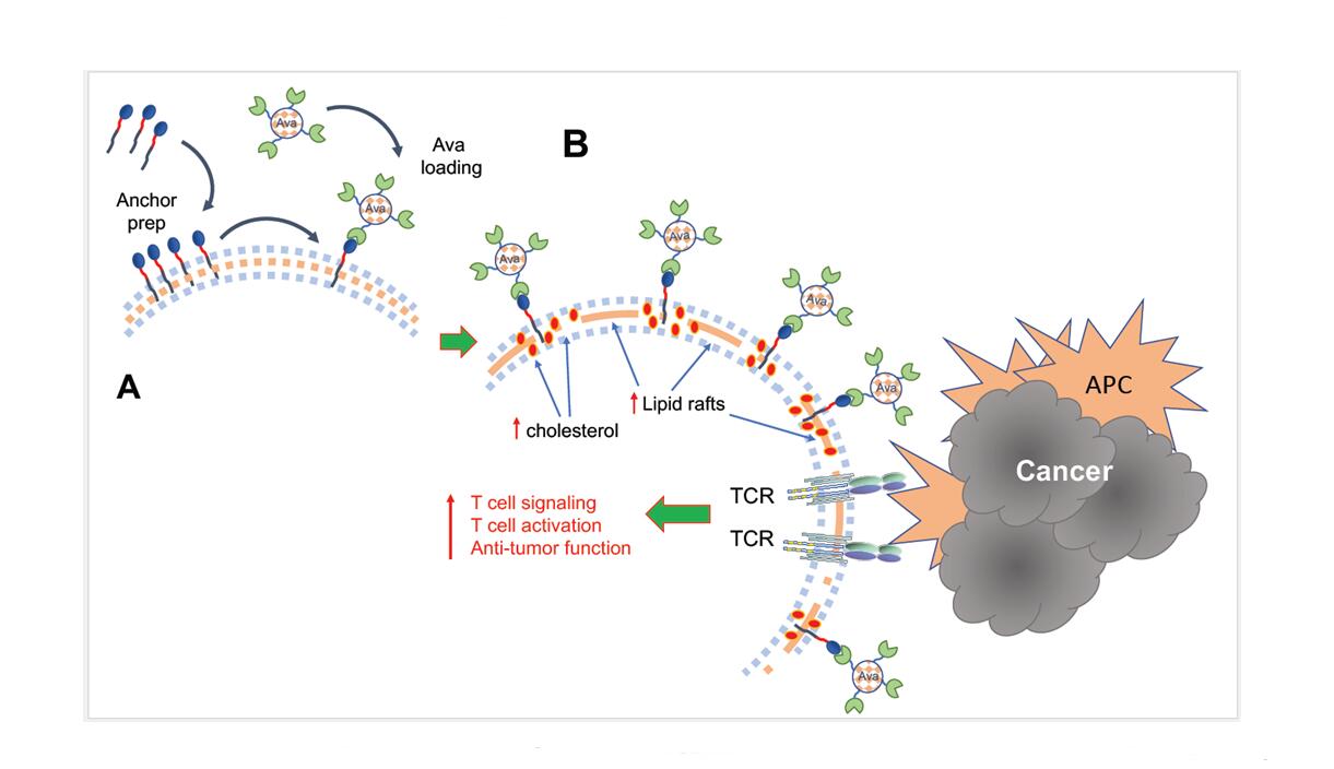 Figure 1. (A) Implementation of a cell surface anchor-engineering technology facilitated by the insertion of tetrazine (Tre) groups in the plasma membrane allowed capture of liposomal Ava containing bicyclo [6.1.0] nonyne (BCN) at the T cell surface. (B) This approach increased the fraction of cholesterol present at the cell membrane, leading to enhanced formation of lipid rafts, TCR aggregation and amplification of TCR signaling after engagement by tumor antigens presented by antigen presenting cells (APC), resulting in augmented T cell activation and antitumor function.