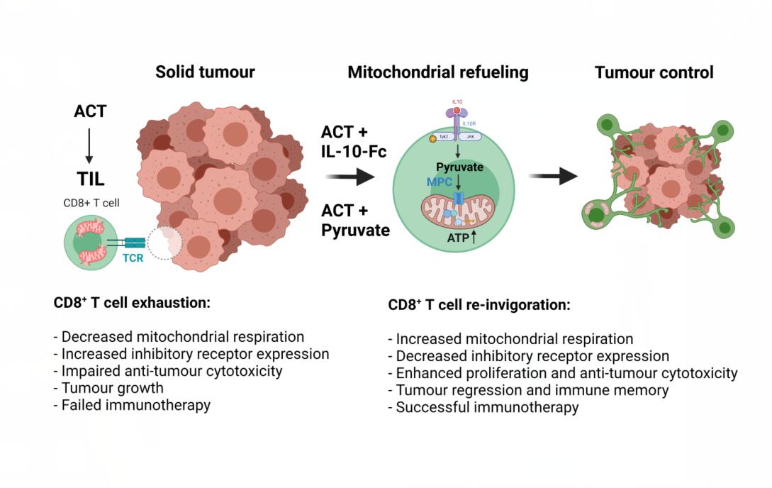 Immunotherapy is a type of biological therapy that uses the bodys own immune system to treat cancer. It is often achieved by adoptive T cell transfer (ACT) and immune checkpoint blockades (ICBs), which preferentially target tumour-infiltrating lymphocytes (TILs), but fails to work in most patients. This failure is often attributed to the adoption of an “exhausted” T cell phenotype. Defining T cell exhaustion is complex, but the term primarily describes CD8+ effector T cells with a reduced capacity to secrete cytokines and elevated expression levels of inhibitory receptors [1]. In tumours, exhaustion of TILs can impair cytotoxic killing, which subsequently enables tumour progression. Two major subsets of exhausted CD8+ T cells include an ICB-responsive “progenitor exhausted” subset that can proliferate and differentiate into an ICB-unresponsive “terminally exhausted”. Nutrient restriction in the tumour microenvironment (TME) and impaired mitochondrial bioenergetics of TILs is a contributing factor to exhaustion and impaired anti-tumour killing. Writing in Nature Immunology, Guo et al. explored the possibility of reinvigorating terminally exhausted CD8+ T cells by combining a “metabolic intervention”, comprised of an IL-10-Fc fusion protein to restore mitochondrial fitness, in combination with ACT or ICB immunotherapy [2]. Their findings provide strong preclinical evidence that metabolic interventions can promote proliferation and cytotoxic activity of terminally exhausted effector T cells to enhance cancer immunotherapy.