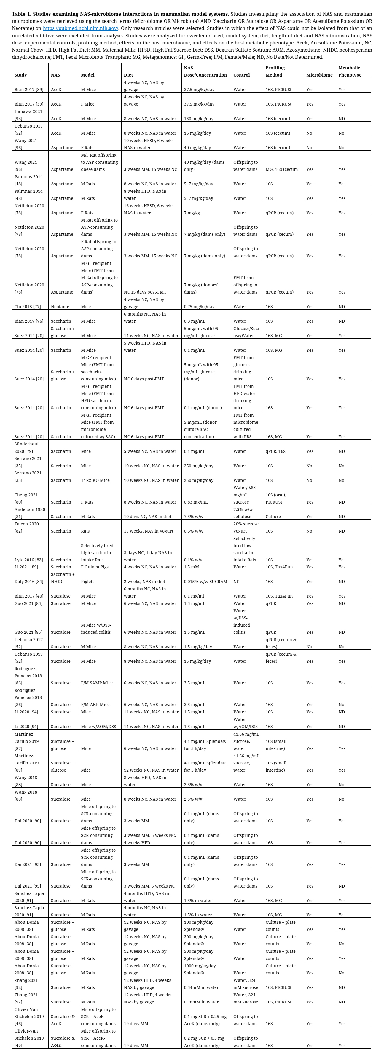 Table 1. Studies examining NAS-microbiome interactions in mammalian model systems. Studies investigating the association of NAS and mammalian microbiomes were retrieved using the search terms (Microbiome OR Microbiota) AND (Saccharin OR Sucralose OR Aspartame OR Acesulfame Potassium OR Neotame) on https://pubmed.ncbi.nlm.nih.gov/. Only research articles were selected. Studies in which the effect of NAS could not be isolated from that of an unrelated additive were excluded from analysis. Studies were analyzed for sweetener used, model system, diet, length of diet and NAS administration, NAS dose, experimental controls, profiling method, effects on the host microbiome, and effects on the host metabolic phenotype. AceK, Acesulfame Potassium; NC, Normal Chow; HFD, High Fat Diet; MM, Maternal Milk; HFSD, High Fat/Sucrose Diet; DSS, Dextran Sulfate Sodium; AOM, Azoxymethane; NHDC, neohesperidin dihydrochalcone; FMT, Fecal Microbiota Transplant; MG, Metagenomics; GF, Germ-Free; F/M, Female/Male; ND, No Data/Not Determined.