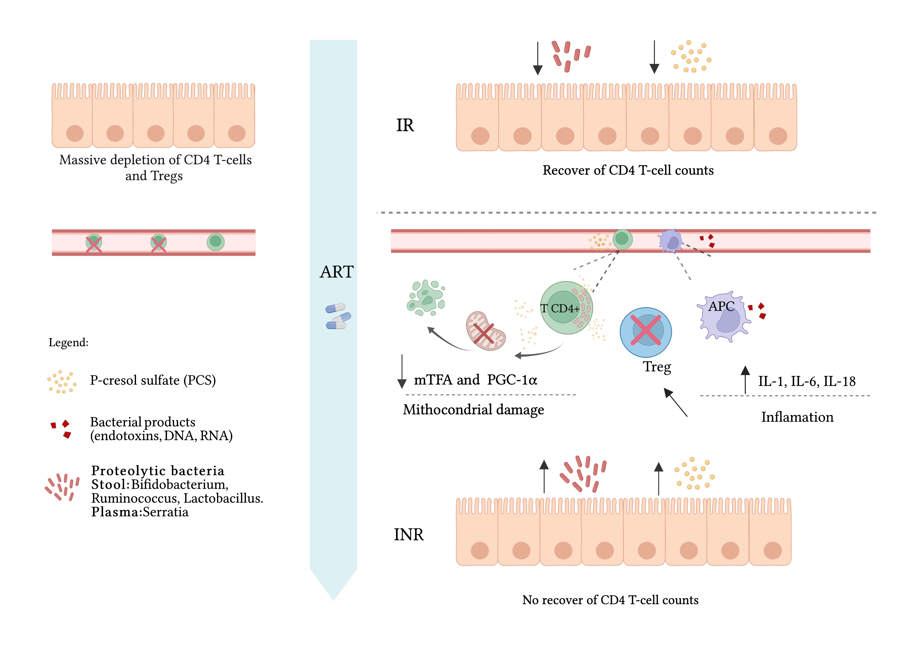Figure 1. Following HIV-1 infection, a massive depletion of gut-CD4 T and Tregs occurs in INR; following ART, the heightened levels of proteolytic bacteria producing toxins (e.g., PCS) impedes CD4 T-cell reconstitution and promotes CD4 T-cell exhaustion. Bacterial translocation to the bloodstream (e.g., Serratia) induces inflammatory milieu that impedes Treg differentiation and function rendering CD4 T-cell proliferation out of control. CD4 T-cells become exhausted and loose the capacity to regenerate mitochondria by diminishing the expression of mTFA and PGC1α both essential for mitochondrial biogenesis.