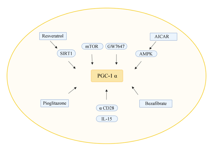 Figure 2. Overview of the possible induction of PGC1α-mediated mitochondrial biogenesis by resveratrol, bezafibrate, AICAR, GW7647, and Pioglitozone. Resveratrol: activator of SIRT1. AICAR: activate AMPK. Bezafibrate: PPAR pan-agonist. Pioglitazone and GW7647: PPARα and PPARγ agonists. IL-15: Activator of mTOR.