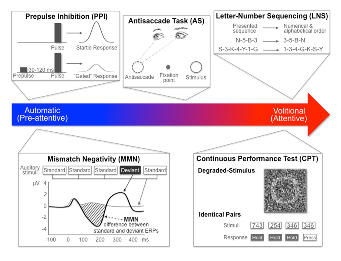 Neurocognitive dysfunction is a hallmark of SZ, leading to impaired quality of life and poor functional outcome [56–58]. As such, neurocognitive deficits are endorsed by the Measurement and Treatment Research to Improve Cognition in Schizophrenia (MATRICS) and the Food and Drug Administration (FDA) as targets for the development of new treatments for SZ [59,60]. Data from the North American Prodrome Longitudinal Study (NAPLS) has further demonstrated that measures of neurocognitive functioning in SZ may have predictive utility in identifying clinically high-risk subjects who will convert to psychosis [61,62]. Some researchers have suggested that the neurocognitive deficits in attention, learning, and memory that characterize SZ may arise from a primary impairment in the filtering or “gating” of sensory information [63]. According to this hypothesis, an inability to filter out irrelevant external stimuli leads to the psychotic symptoms (e.g., hallucinations, delusions) and cognitive disorganization observed in SZ. Therefore, studying an array of endophenotypes that range from largely automatic (i.e., preattentive) neurophysiological measures to highly volitional (i.e., attentive) neurocognitive measures may provide a window into the biological processes underlying SZ. Examples of several promising endophenotype paradigms are discussed below and shown in Figure 2.