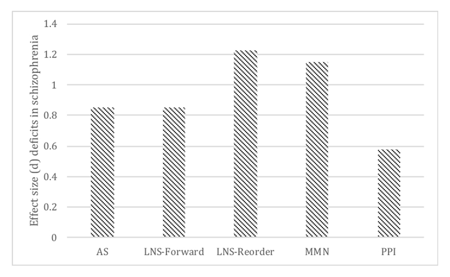Figure 3. Effect sizes (Cohen’s d) of potential SZ endophenotypes as analyzed by Light and colleagues [64]. AS: antisaccade; LNS: letter-number sequencing; MMN: mismatch negativity; PPI: prepulse inhibition.