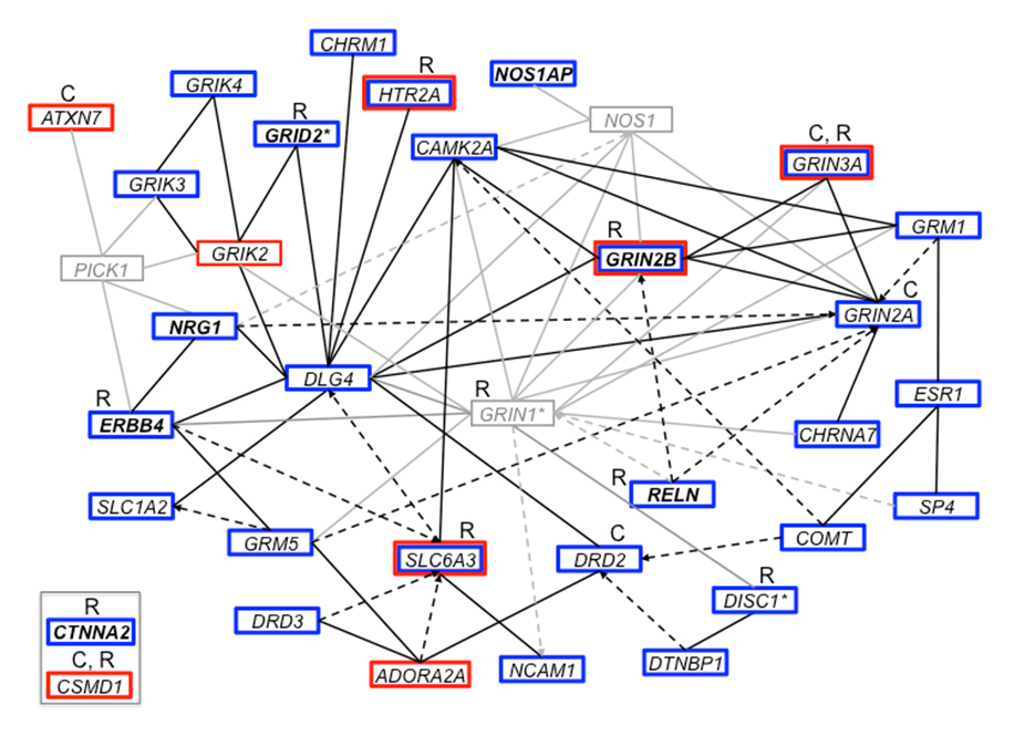 Figure 4. Ingenuity Pathway Analysis of the genes identified through association and linkage analyses of the endophenotypes discussed in this review. Genes are represented as nodes with solid lines representing direct protein-protein interactions and dashed arrows representing more indirect effects on expression, activation, or inhibition. Genes and interactions in black show association (blue box) or linkage (red box) with the endophenotypes listed in this review in the COGS study, whereas those in gray represent other interacting genes. Genes in a bold font are associated with at least two endophenotypes from this review and span neurophysiological and neurocognitive domains. Genes identified as associated with SZ diagnosis by GWAS of common variants are indicated with a “C,” whereas those identified by studies of rare and de novo variation are indicated with an “R.” *GRIN1 showed evidence of both association and linkage with other neurocognitive endophenotypes in the COGS study, and both DISC1 and GRID2 showed evidence of linkage with neurophysiological endophenotypes in the COGS study. Note that CSMD1 and CTNNA2 were prominent genes in these analyses, with external support from studies of SZ diagnosis, but do not directly connect into the defined network. COGS: Consortium on the Genetics of Schizophrenia; GWAS: genome-wide association study; SZ: schizophrenia.