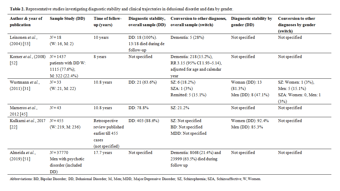 Table 2. Representative studies investigating diagnostic stability and clinical trajectories in delusional disorder and data by gender.
