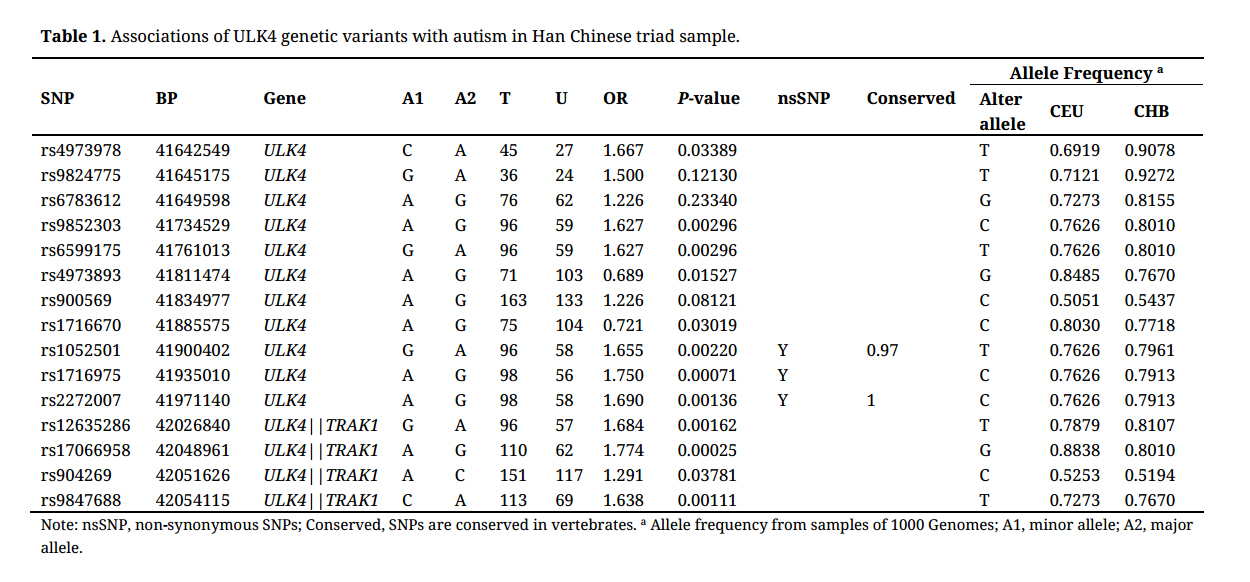 Conclusion: We provide evidence at multiple layers for ULK4 common genetic variants associated with the risk of autism. This may have clinical implication for translational research and precision psychiatry.
