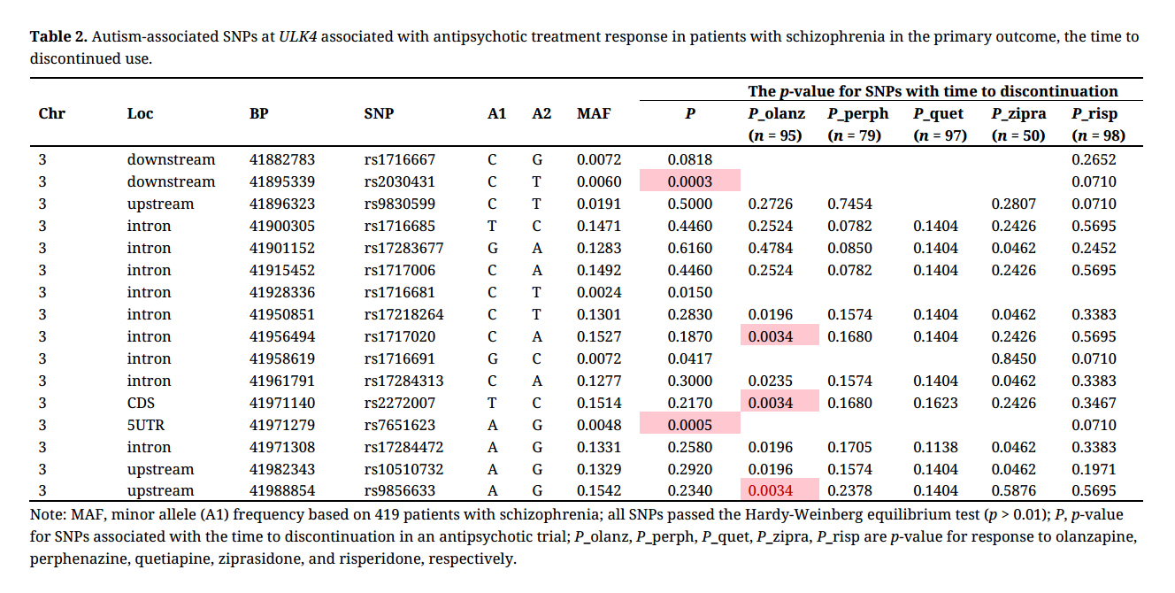 Results: Multiple functional SNPs including rs2272007 in strong linkage disequilibrium at ULK4 were associated with autism in the Han Chinese sample (minimum p < 0.00071) which survived the Bonferroni correction for multiple testing. SNP rs2272007 and other SNPs were significantly associated with ULK4 expression in postmortem human prefrontal cortex in subjects across the lifespan and multiple brain areas in two independent datasets. In addition, two SNPs rs7651623 (Hazard Ratio, HR = 16.33; p = 5.00 × 10−4) and rs2030431 (HR = 17.25; p = 3.00 × 10−4) in strong LD were associated with the risk of discontinuing use of antipsychotic medications in the patients with schizophrenia. SNP rs2272007, perfect LD with rs7651623, was associated with treatment response in olanzapine only (HR = 4.22; p = 0.0034).