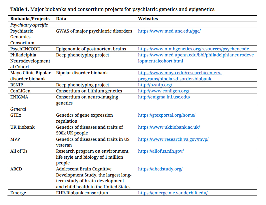 Developing biobanks coupled with electronic health records (EHR) is an attractive approach to establish large datasets that can be used for studying the biology of various diseases, including psychiatric disorders. Vanderbilt University, Partners HealthCare, and the Mayo Clinic are a few institutes leading the efforts to implement hospital-wide programs. BioVU (https://victr.vumc.org/pub/biovu/) is the Vanderbilt biobank contains medical records of more than 200,000 subjects. The Partners HealthCare Biobank (https://biobank.partners.org/) serves affiliated hospitals in the Boston area. More than 100,000 subjects have been collected by them so far. About 30,000 subjects have been collected by the Mayo Clinic Biobank. Moreover, Mayo Clinic has a separate Biobank specific for bipolar disorder [27]. The Electronic Medical Records and Genomics (eMERGE) network [28], involving ten institutes including Vanderbilt, MGH, and Mayo clinic, has been the major NIH-funded project utilizing medical records for genomic research. ADHD and ASD are part of the project. Otherwise, current EHR-biobank projects do not have a major emphasis on psychiatric disorders yet.