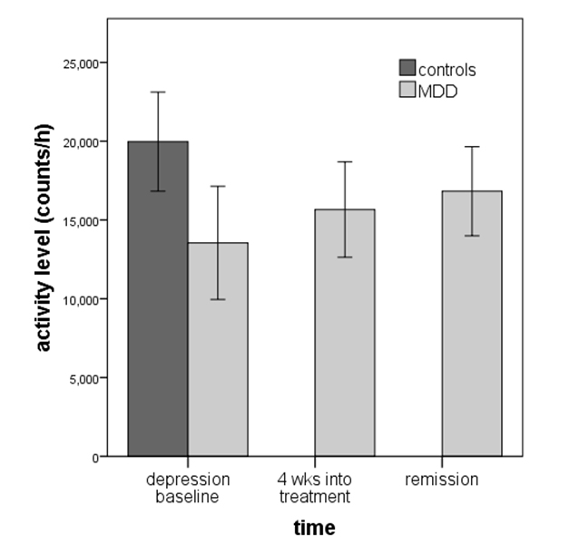Psychomotor Disturbance Assessed Outside of LabPmR and PmA will also be assessed in daily behaviors measured outside of the lab. This is a significant feature of the study as it provides objective, continuous assessments of motor behaviors in naturalistic settings. We are employing two “outside of lab” measures. First, we are capturing naturalistic gross motor behavior using wrist-worn actigraphy. Actigraphy is a non-invasive method of continuously recording total body movement over days and weeks, and has been used to reliably assess (a) activity level and (b) stability of movement patterns (our indicators of PmR and PmA, respectively), even in severe psychopathologies [19]. Importantly, MPI Walther has shown that actigraphy-assessed motor behavior predicts the course of MDD over and above clinician ratings of PmR and PmA (see PRELIMINARY STUDIES below).
