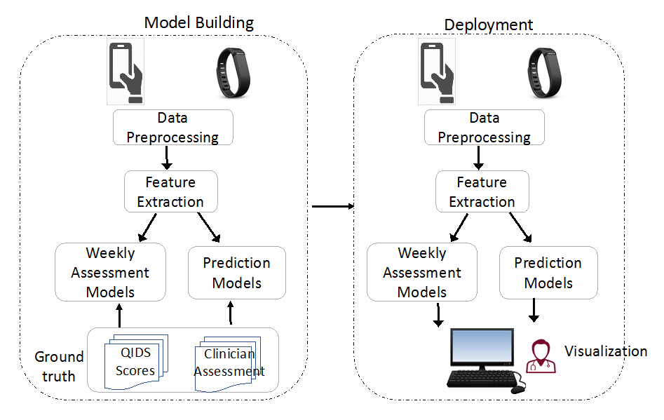 Figure 1. DepWatch: high-level approach. The ground truth includes self-reported QIDS (Quick Inventory of Depressive Symptomatology) scores, and Monthly clinician assessment (including review of weekly QIDS scores and participant interview).