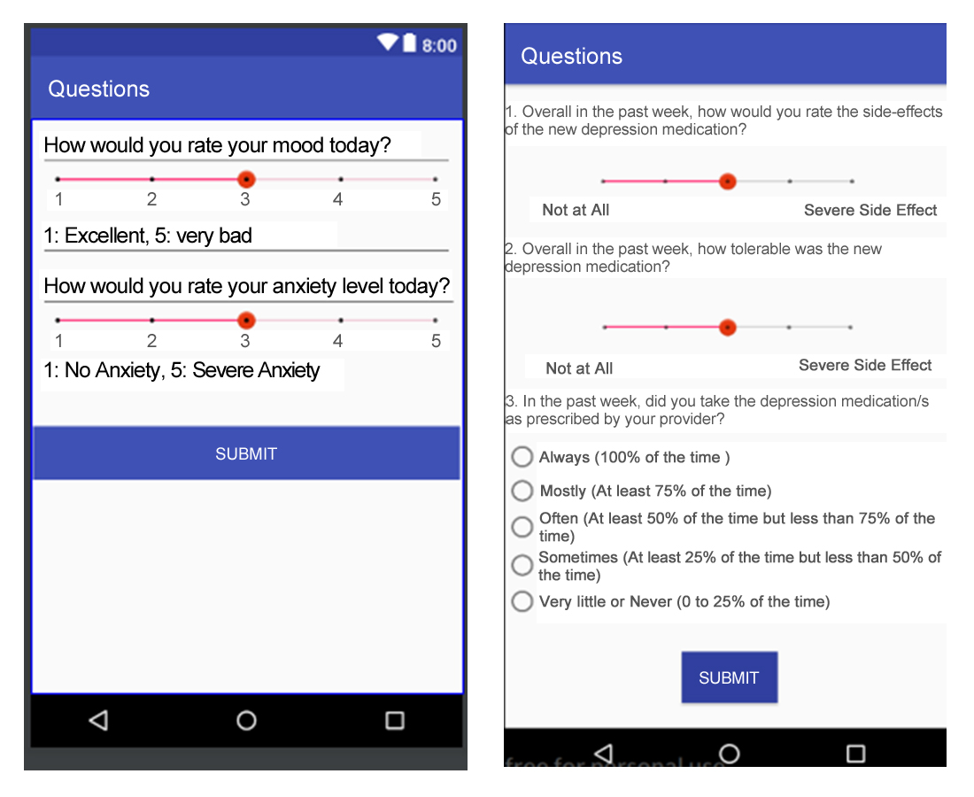 The project started in August 2019. We have completed developing the data collection system. Figure 2 shows the two daily questionnaires (on mood and anxiety) and three weekly questionnaires (on safety, tolerability, medication adherence) that have been developed in the LifeRhythm app. The app runs in the background, passively collecting sensory data. When it is the time to fill in the questionnaires, notifications will be sent to the users to remind them to fill them in. We stated recruiting participants for Phase I study in January 2020. As the data are being collected, we will analyze the data and develop, train and cross validate machine learning models to provide symptom assessment and predict the trajectory of response.