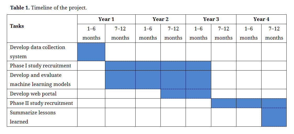 The study is organized around two phases (see the timeline of the project in Table 1). The two primary goals of Phase I are (i) data collection and (ii) development, training, and cross-validation of the machine learning models, which will be incorporated in DepWatch system. In Phase II, we will arrange for clinicians to actively use the DepWatch system developed in Phase I to evaluate usability and efficacy. Subject recruitment of both phases will proceed through IRB-approved announcements and procedures. In this section, we briefly describe the study procedures; more details on the technical challenges are deferred to later sections.