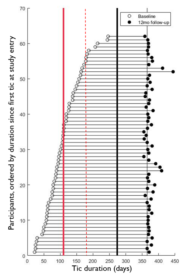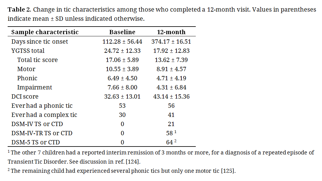 Studying pathophysiology of recent-onset tics has been considered laudable but impracticable, as recent-onset tics may not be identified as such nor bring the child to medical attention. For instance, in one study the estimated delay between tic onset and first clinical contact was 10 years [41]. However, by intensive recruitment efforts, we have been able to recruit at an adequate pace children who had tics for less than 6 months (more recently allowing up to 9 months; hereinafter “New Tics”). We now have 12-month outcome data on 63 children with New Tics. We have discovered fascinating clinical results, and are beginning to identify biological predictors of outcome.