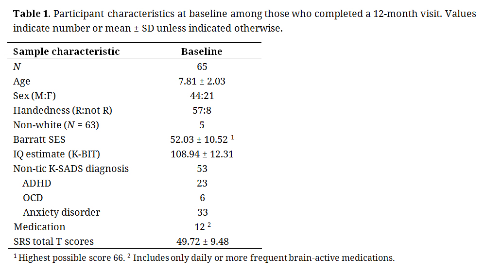 Of the 82 New Tics participants who have completed a first visit, 65 have returned for the 12-month follow-up visit and an additional 9 are still awaiting return visits, leaving only 8 (9.6%) who dropped out or were lost to follow-up. After the first 44 participants, we began to invite New Tics subjects to return at 24, 36 or 48 months after their first tic. As of April, 2020, we have completed 31 24-month, 10 36-month and 6 48-month visits.