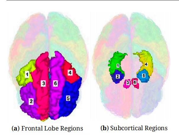 Figure 2. (a) Frontal Lobe Regions: Caudal Middle Left (1) and Right (4); Rostral Middle Left (2) and Right (5); Superior Left (3) and Right (6). (b) Subcortical Regions: Hippocampus Left (1) and Right (4); Amygdala Left (2) and Right (5); N. Accumbens Left (3) and Right (6).
