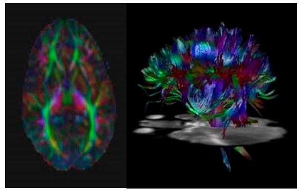 Figure 4. Diffusion Tensor Imaging Data: A color-coded anisotropy map (left) reveals white matter fiber orientation (red = right/left, green = ant/post, blue = sup/inf). The fiber pathways are reconstructed (right; color-coded as on the left).