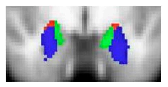 Figure 5. Amygdala Sub-regions (blue: centromedial; red: laterobasal nucleus; and green: superficial).
