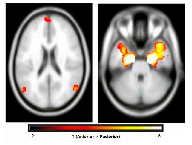 Figure 6. Functional Connectivity (FC): Anterior and posterior Hippocampus (HIPP) show different patterns of FC; anterior HIPP exhibits stronger FC with default network (left) and anterior temporal lobe (right).