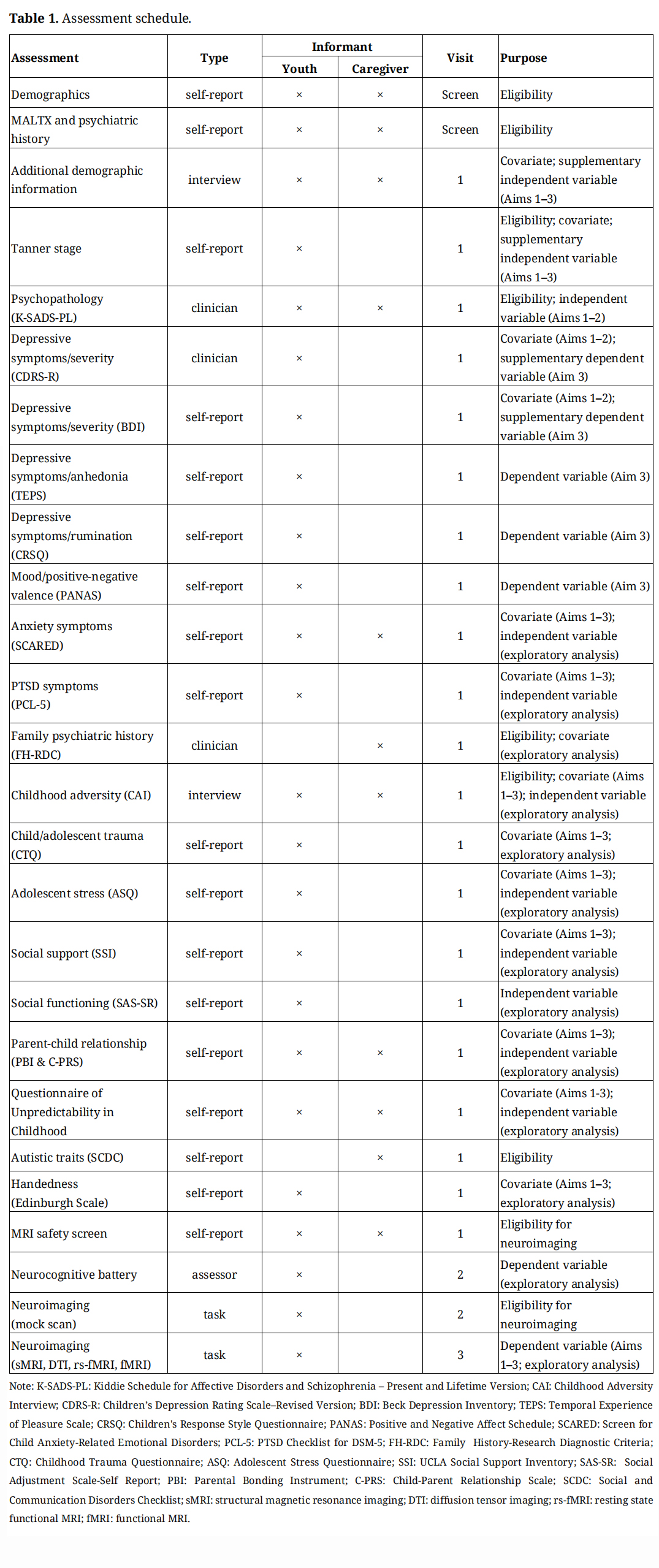 Visit 1 assessments, as indicated in Table 1, also include clinician administration of the Children’s Depression Rating Scale–Revised Version (CDRS-R) to assess for symptom severity [95,96], and a self-reported depression scale (Beck Depression Inventory) [97]. Additional self-report measures include the Temporal Experience of Pleasure Scale (TEPS) to assess individual traits in anticipatory and consummatory experiences of pleasure [98], and the rumination subscale of the Children's Response Style Questionnaire (CRSQ), which asks about participants' use of self-focused thoughts regarding the causes and consequences of depressed mood [99]. Supplemental to clinician-determinations of abuse severity on the CAI, participants also complete MALTX experiences using the Childhood Trauma Questionnaire (CTQ) Short Form [100].