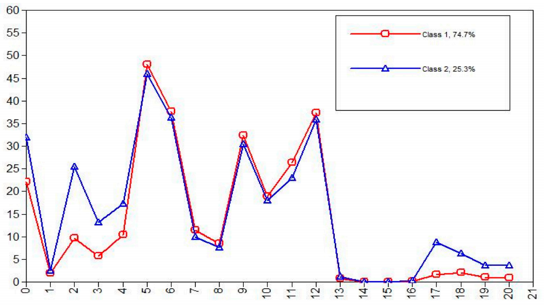 Figure 1. LCA Profiles depicts LCA means for the two classes on y-axis (N = 2836). The x-axis categories are the following (abbreviations and descriptions can be found in s5a “Self-report Measures”): 0. PSS 1. LEC 2. SPS 3. CESD 4. STAI-Trait 5 & 6 TEPS (anticipatory and consummatory) 7–12 SFS subdomains 13. Cannabis use 14. Opiod use 15. Amphetamine Use 16. PSQI 17.PQ-Unusual thought content 18. PQ-Paranoia 19. PQ-Perceptual Disturbances 20. PQ-Disorganization.