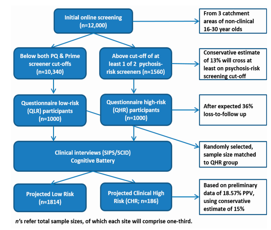 The MAP study was funded in July of 2017. This study will use a prospective, longitudinal design across 3 demographically diverse catchment areas. In years 1–4, 12,000 participants will complete an online battery of self-report questionnaires assessing risk factors for psychosis, clinical correlates of psychosis, and 3 psychosis-risk screening questionnaires. Based on established cut-off scores from 2 of these psychosis-risk screening measures, the PQ and the Prime (see Psychosis-Risk Measures; the Prod Screen was not used for selection of participants due to substantial over endorsement of symptoms in pilot testing prior to the study beginning), an estimated 26% of participants (13% questionnaire higher risk-QHR; 13% questionnaire lower risk-QLR) will complete structured diagnostic interviews that assess psychosis-risk syndromes and DSM-5 Psychopathology (2000 interviews total across the 3 sites). These projected sample sizes are based on pilot data in Criterion Validity (P selection is described further in S4d) and accounts for 36% potential loss to follow-up (i.e., 13% of 12,000 participants = 1560 QHR; therefore interviewing 1,000 of these individuals allows for loss-to-follow-up). We also have strategies in place to encourage retention, including incentivizing the in-person interview more than the online battery.