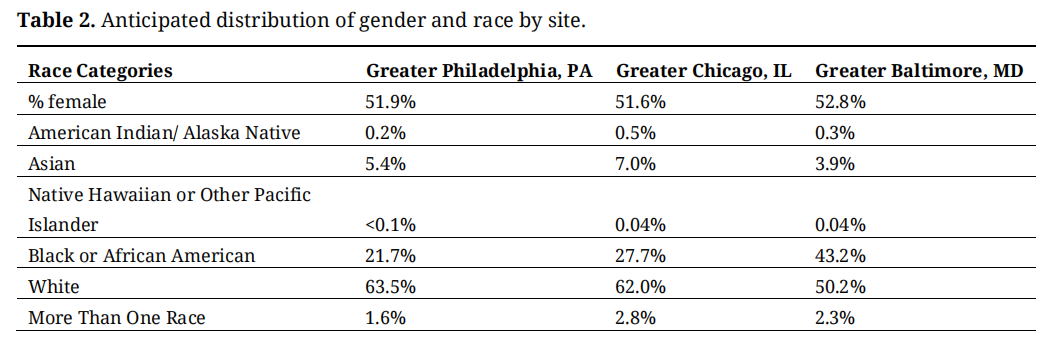 Participants will be a socioeconomically, racially, and ethnically diverse sample of male and female adolescents/young adults (ages 16–30) from 3 catchment areas: Philadelphia County (PA), Cook (IL; includes Chicago) and Baltimore City/County (MD). There will be an equal gender distribution (see Table 2 for projected demographic and gender distributions by site).