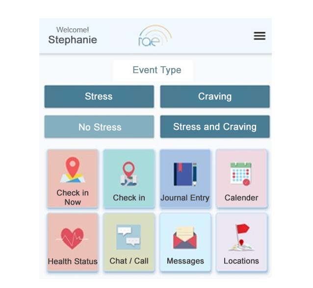 Anticipated findings and future directions: The RAE platform is a potentially powerful tool to de-escalate stress and craving outside of the clinical milieu, and to connect with a support system needed most. RAE also aims to provide clinicians with actionable insight to understand patients’ level of risk, and contextual clues for their triggers in order to provide more personalized recovery support.