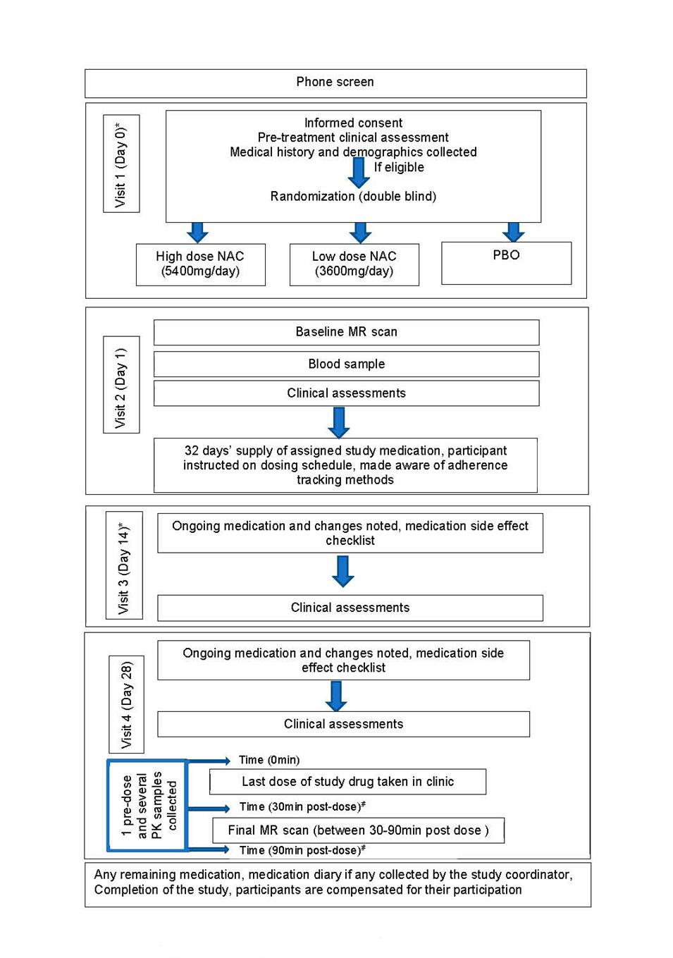 The MR scanning will start about 30min post dose on the Day 28 (visit 4) and last until about 90min post-dose. Our group has previously reported that the maximum blood concentration of NAC following an oral dose is achieved in ~1.5 h [27]. We needed to balance brain measures and blood measures around this time window to quantitatively capture the maximum likely change in the biological signatures as measured in the brain and the blood.