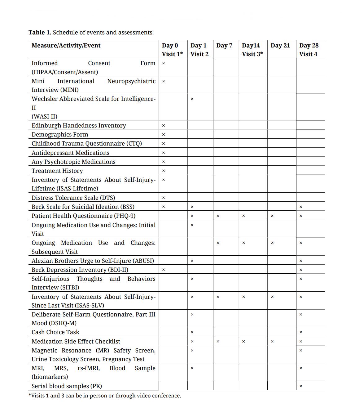 Study procedures, participant timelineThe stage 1 (R61) study protocol was approved by the Institutional Review Board (IRB) at the UMN and by an external IRB (Advarra IRB), per the clinical research requirements outlined by UMN for the Department of Psychiatry and Behavioral Sciences. In this study there are a total of 4 visits. For 2 of these, patients have the option to complete them through video conferencing. In addition to these visits, there are 2 instances where the participants will electronically complete questionnaires on their own. Eligibility is confirmed by a telephonic screening after which consent is recorded at visit 1. Figure 1 represents the participant timeline. Table 1 details several clinical assessments collected throughout the study.