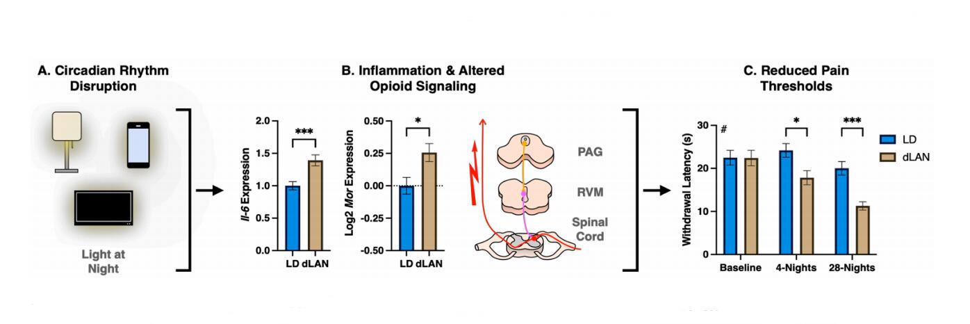 Figure 1. Circadian rhythm disruption alters pain thresholds. (A) Male CFW mice at 8-weeks of age were exposed to control light-dark cycles (14: 10 h light-dark; LD) or dim light at night (14:10 light-dim; 5-lux at night; dLAN) for four weeks. (B) Mice housed in dLAN for 28-nights exhibited heightened Il-6 and Mor transcript expression in the medulla and periaqueductal gray, respectively. (C) Mice housed in dLAN for 4- and 28-nights exhibited cold hyperalgesia to a cold plate test at 0 ± 1 °C. Gene expression data were analyzed with unpaired 2-tailed t-tests. Behavioral data were analyzed using a repeated measures ANOVA. Data in the figure were modified with permission from Bumgarner et al., 2020 [20]. # —Main effect of lighting condition, * p < 0.05, *** p < 0.001.