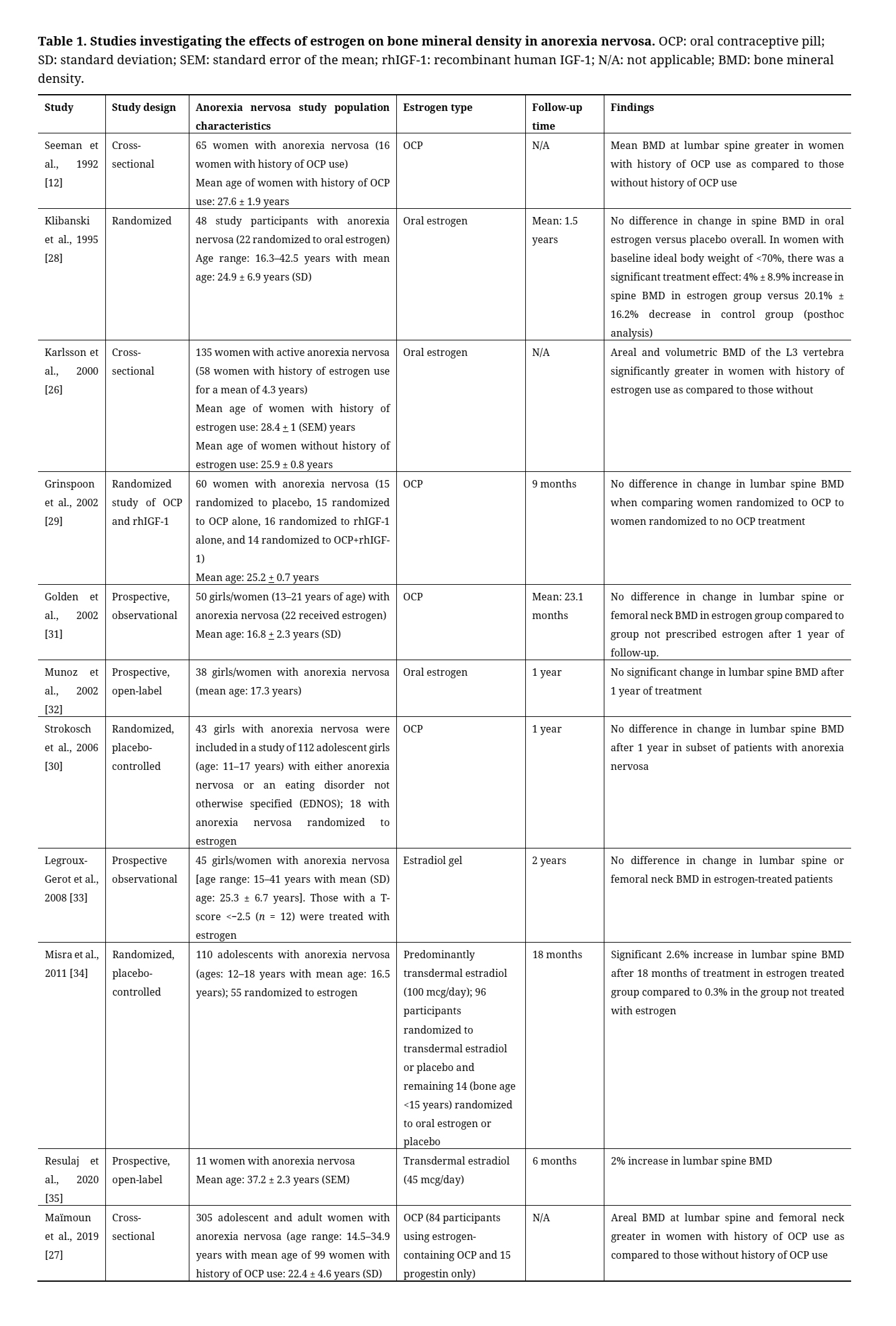 Table 1. Studies investigating the effects of estrogen on bone mineral density in anorexia nervosa. OCP: oral contraceptive pill; SD: standard deviation; SEM: standard error of the mean; rhIGF-1: recombinant human IGF-1; N/A: not applicable; BMD: bone mineral density.