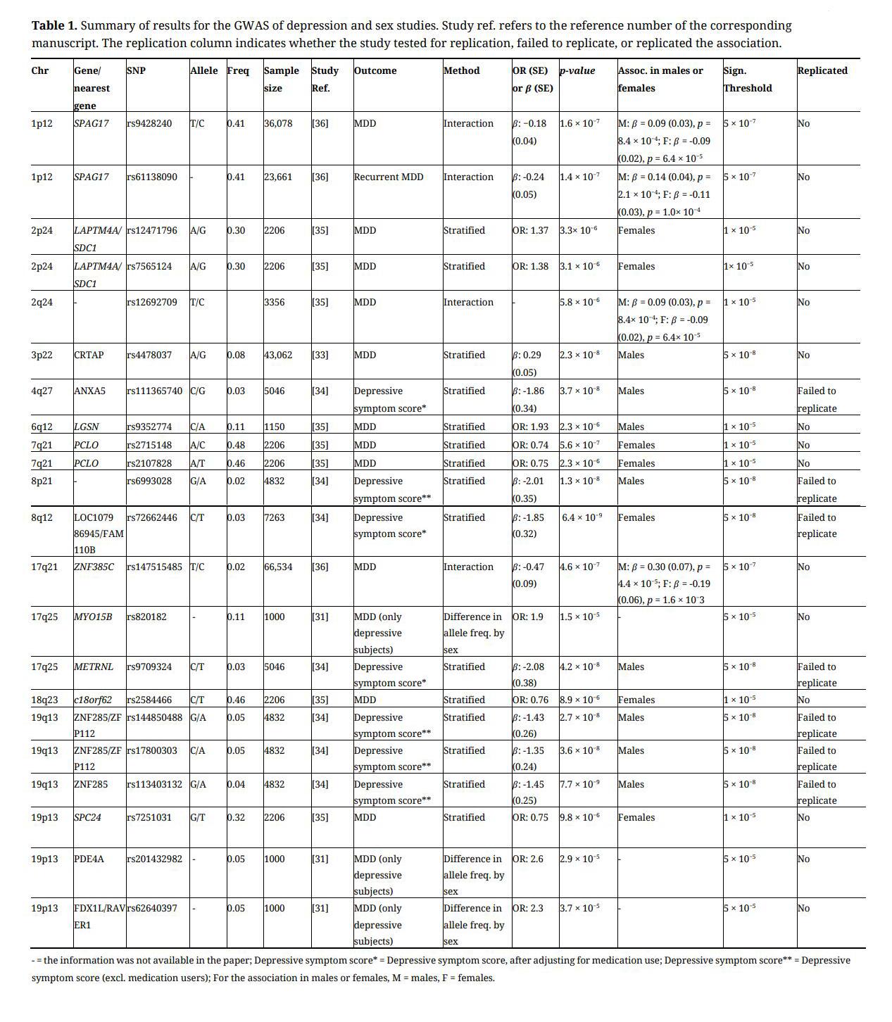 In addition to stratifying by sex, a few studies have examined genome-wide SNP-by-sex interactions on depression. The GWAS for the Netherlands NESDA and NTR populations stratified by sex and also found 1 SNP-by-sex interaction using a significance level of p < 10−5 and 38 SNP-by-sex interactions using a significance level of p < 10−4 [35]. In the PGC (Psychiatric Genomics Consortium) and iPsych consortiums, among 32,408 MDD cases and 109,946 controls using a significance threshold of 5 × 10−7, a genome-wide SNP-by-sex interaction study found two significant interactions for MDD on chromosome 1p12 and 17q21 [SPAG17, ZNF385C] and a significant interaction for recurrent MDD on chromosome 1p12 [SPAG17] [36].