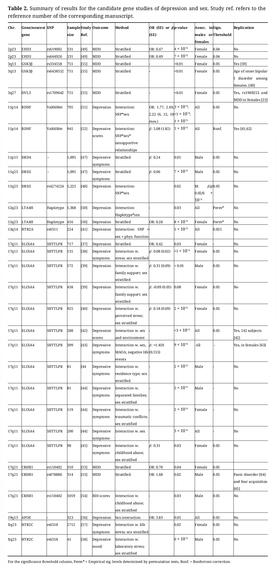 Additionally, while the majority of studies examining sex differences in genetic associations of depression are candidate gene studies, GWAS may provide a more promising avenue for the discovery of sex-specific effects. Candidate gene studies have less of a multiple testing burden than GWAS. While the significance threshold for GWAS is usually 5 × 10−8, the threshold for candidate gene studies can vary, using a significance threshold of 0.05 or a Bonferroni correction of 0.05 divided by the number of SNPs or regions tested. However, candidate gene studies of depression may be underpowered to detect true positive gene-based associations and robust sex-specific effects. For example, the evidence implicating serotonin transporter genes in depression is weak and inconsistent. More GWAS examining sex differences in genetic associations of depression are needed.