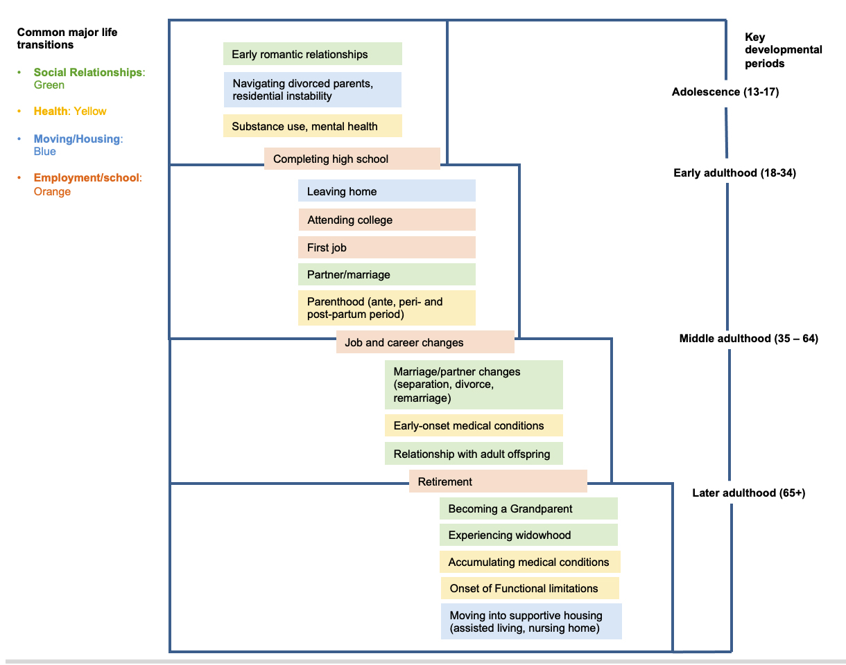 Housing is a central social determinant of (mental) health [37] and housing issues can be disruptive, both on their own and as a correlate of precipitating changes (e.g., financial insecurity, changing jobs, functional decline) [38]. Furthermore, these effects vary throughout the different phases of the life course.