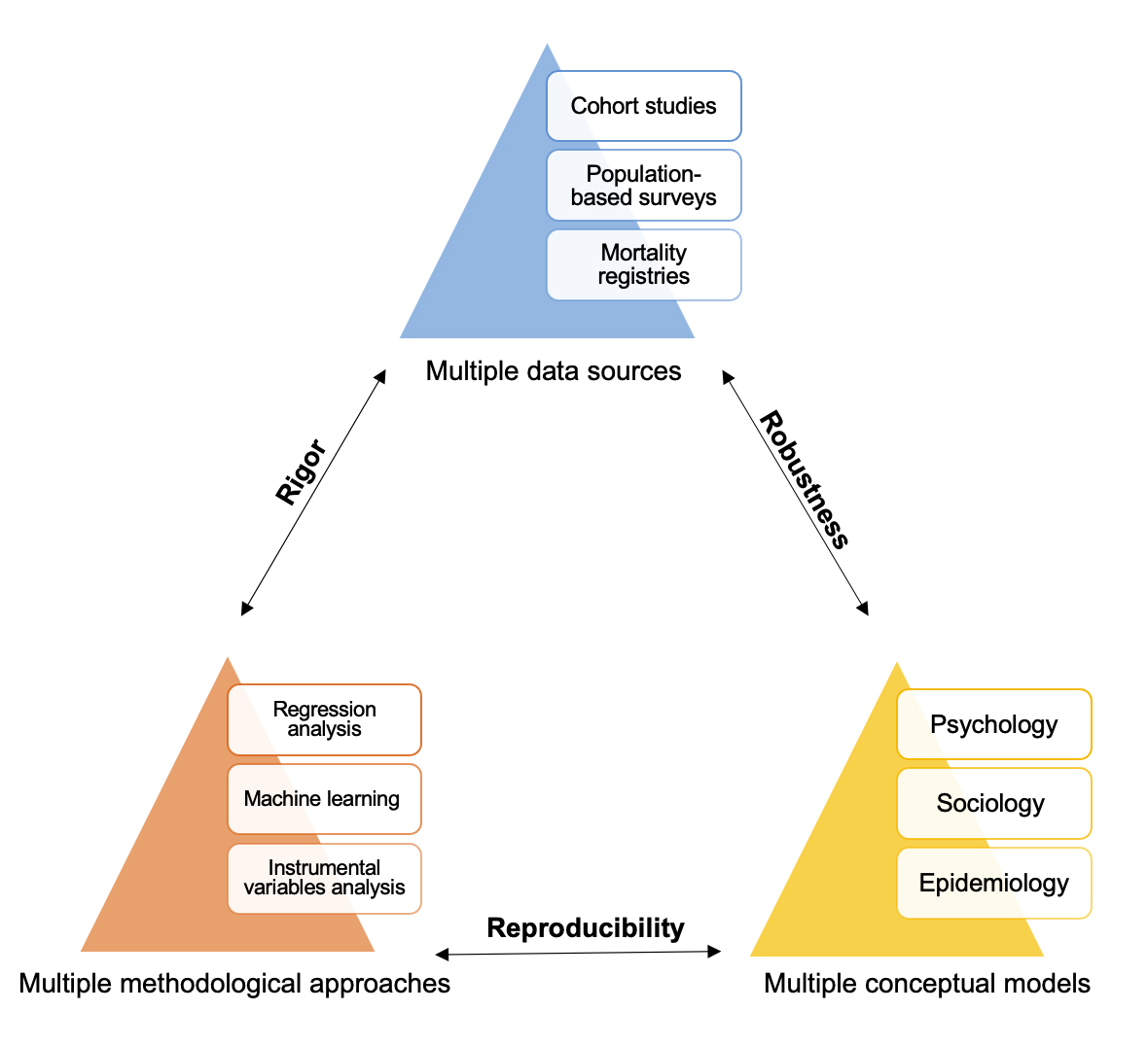 As mentioned above, the Life Course Framework aims to understand the complex variation in suicide risk over the lifespan by examining transitional periods or events. This effort requires a comprehensive epistemological approach to guide the testing of hypotheses. Specifically, triangulation is an overarching approach to research that can enhance rigor and reproducibility and provide a more comprehensive understanding of complex phenomena like SRB [63,64]. Drawing on the foundational underpinnings of mixed-methods research [65,66], as an approach to the research enterprise triangulation leverages multiple data sources, various analytic techniques, and diverse theoretical concepts to address a given research question This approach seeks separate the testing of hypothesized relationships from the specific analytic methods, which each have potential biases and limitations, used to test those relationships [63,64]. In the last two decades, triangulation has been widely applied to multiple disciplines, including sociology, nursing, and education [63,67,68]. As the drivers of SRB reflect a confluence of genetic, biological, psychological, social, and environmental factors, the field would likely benefit from adopting triangulation as an overarching epistemic approach to empirical research.