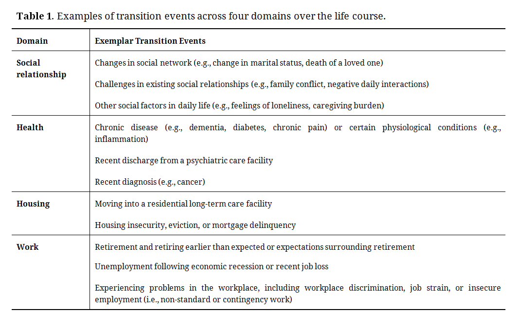 Social roles and connections have long been theorized as central determinants of suicide and suicidal risk behaviors (SRB, e.g., depressive symptoms, hopelessness). The importance of social connections is highlighted by the Interpersonal Theory of Suicide (ITS), a conceptual model that emphasizes thwarted belongingness (e.g., loneliness) and a lack of meaningful social roles, combined with perceived burdensomeness on others, as central to increasing suicide risk [18,19]. The ITS model calls attention to the importance of common transition events of social connection within the life course including a change in marital status, family conflict, and losing loved ones, all of which have been shown to relate to higher suicide risk. For example, a recent meta-analysis found that after adjusting for covariates, the relative risk of suicide in non-married individuals was estimated to be 92% higher compared to their married counterparts [20]. Beyond relationships, other social factors may be protective or risk factors for SRB over the life course (e.g., daily interactions, loneliness, living alone, spousal interactions, social networks, widowhood, caregiving) [21–23].
