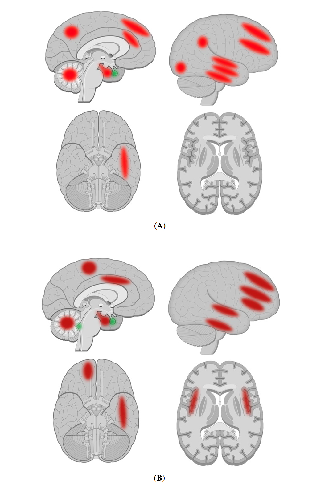 Figure 1. (A) Brain regions found abnormal in structural gray matter studies of CHR compared to control subjects. Red = Thinning or reduced volume. Green = Increased volume. (B) Brain regions found abnormal in structural gray matter studies of CHR converters compared to CHR non-converters. Dark red = Thinning or reduced volume. Green = Increased volume.*Brain images adapted from www.getbodysmart.com.