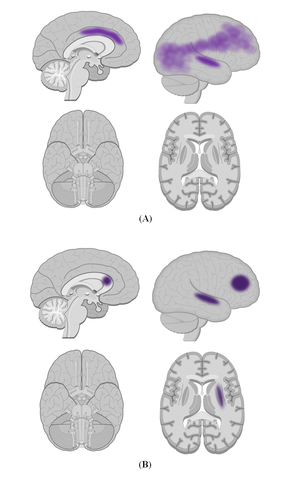 Figure 2. (A)Brain regions found abnormal in white matter studies of CHR compared to control subjects. Purple = Thinning or reduced volume. (B)Brain regions were found abnormal in white matter studies of CHR converters compared to CHR non-converters. Dark purple = Thinning or reduced volume. *Brain images adapted from www.getbodysmart.com.