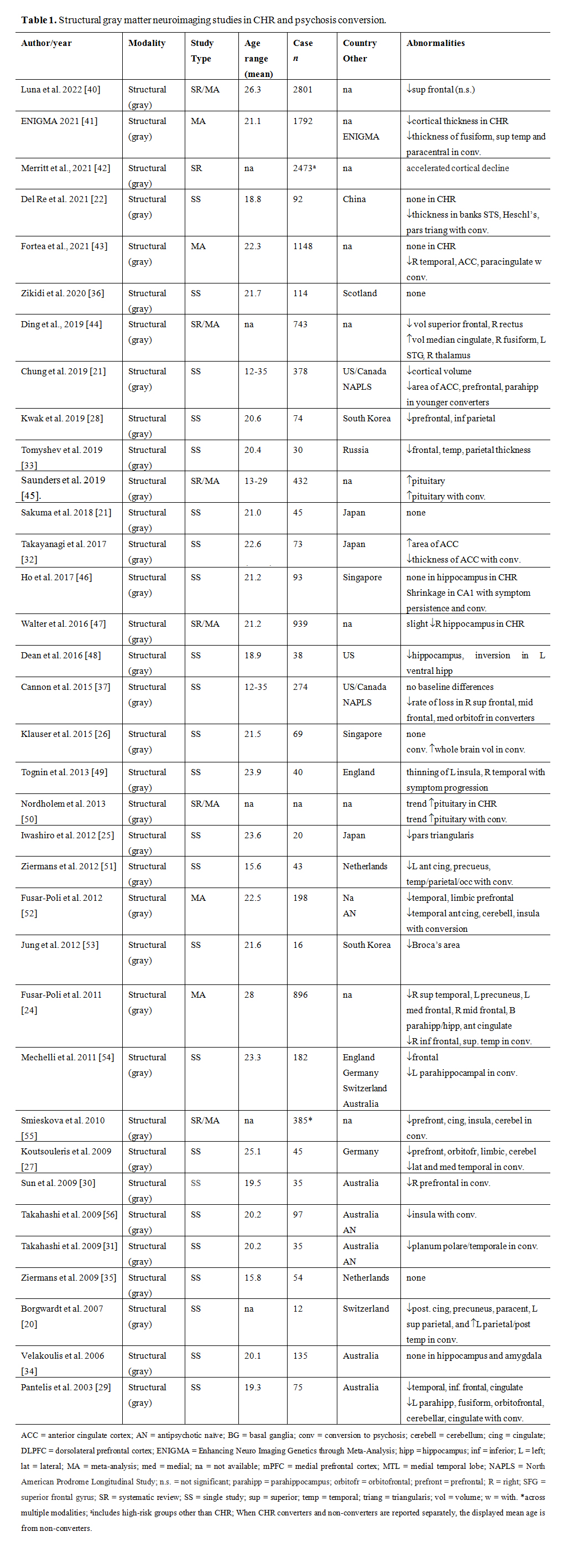 Table 1. Structural gray matter neuroimaging studies in CHR and psychosis conversion.