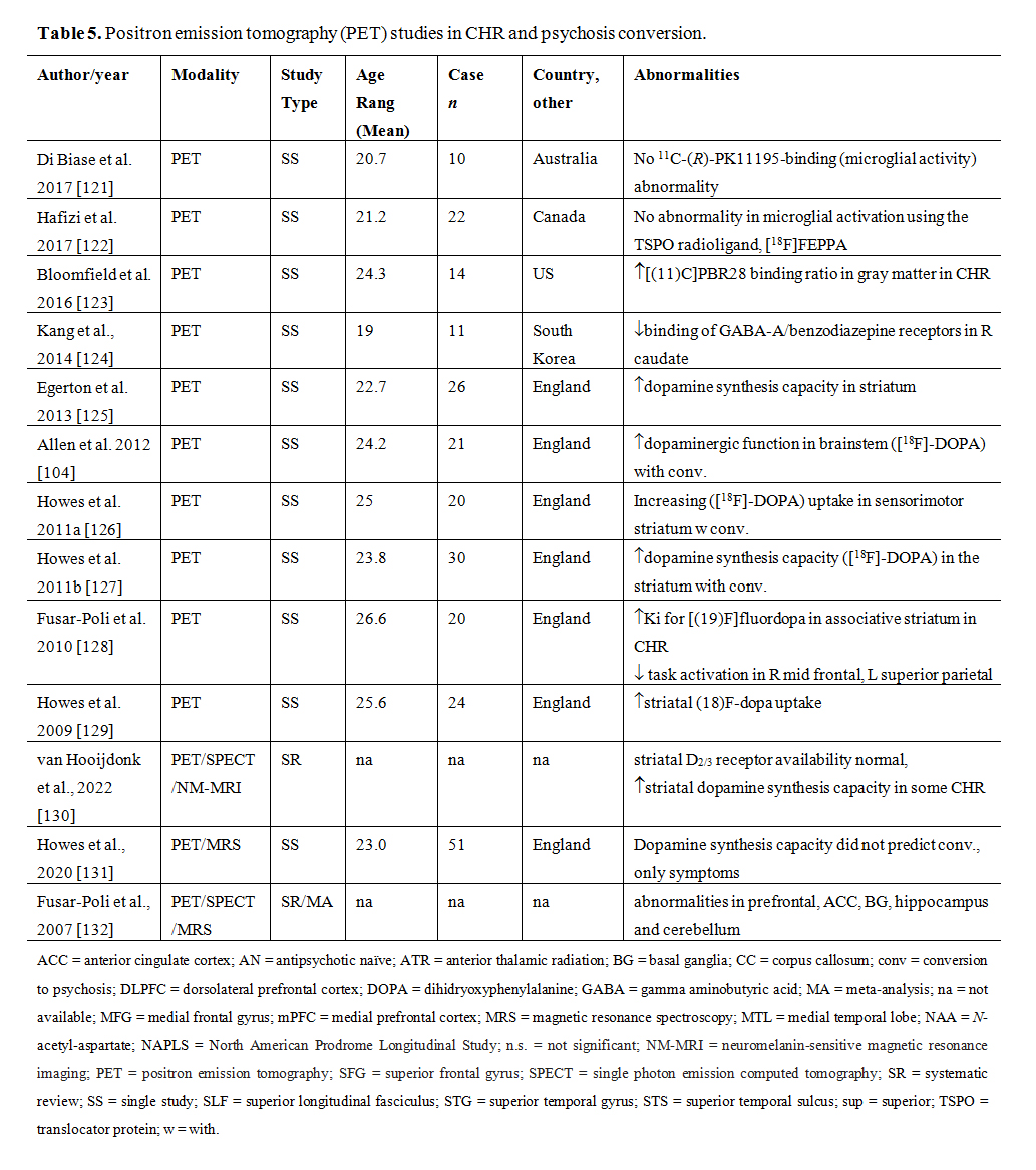 Table 5. Positron emission tomography (PET) studies in CHR and psychosis conversion.